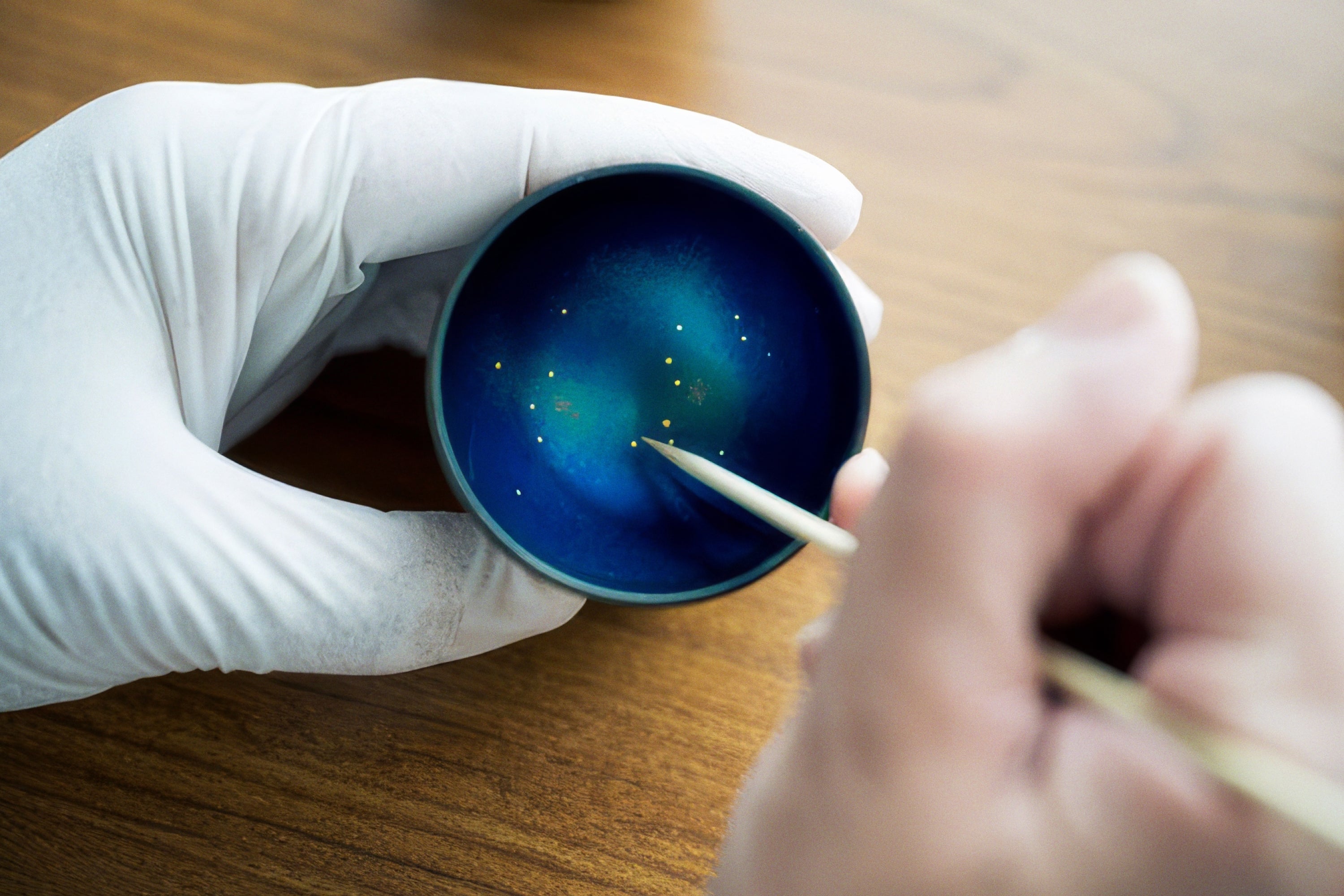 Drawing on techniques honed over generations in Buddhist altar making, Sato created Sora COCORO ("Sky Heart"). Using astronomy references, Sato hand-places each constellation and celestial body with sharpened toothpicks. When filled with sake, the cups reveal shimmering, galaxy-like patterns that evoke the vastness of the cosmos.